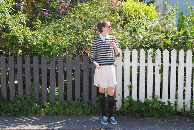 Det her er hvad jeg, Sofie, havde på i onsdags. Kjole fra Urban Outfitters, stribet bluse er min mors gamle, strømper fra Flying A, solbriller fra Retrosales.dk, sko fra Vans og ringe fra Friis & Co, Troldekugler, Line & Jo og andre er vintage.